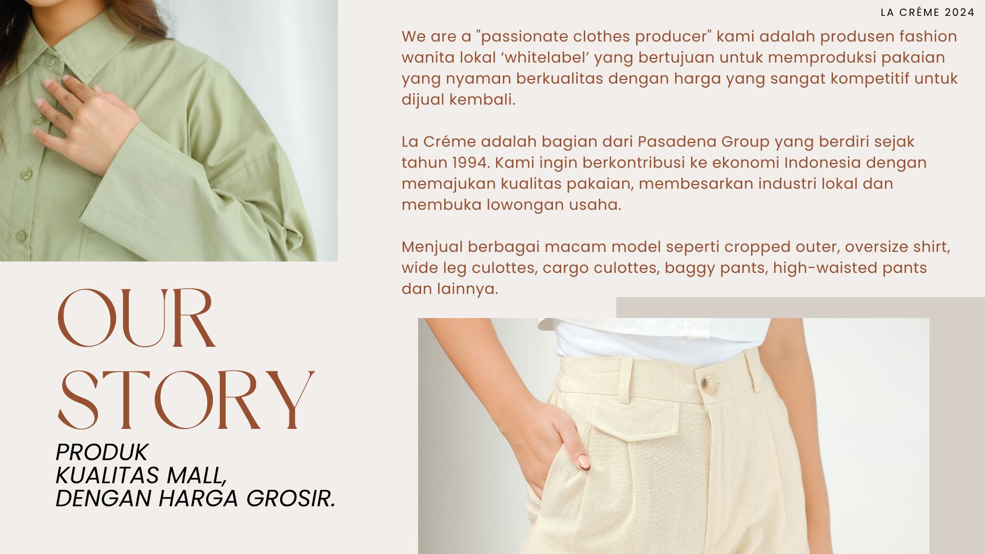 La Créme adalah bagian dari Pasadena Group yang berdiri sejak tahun 1994. Kami ingin berkontribusi ke ekonomi Indonesia dengan memajukan kualitas pakaian, membesarkan industri lokal dan membuka lowongan usaha.